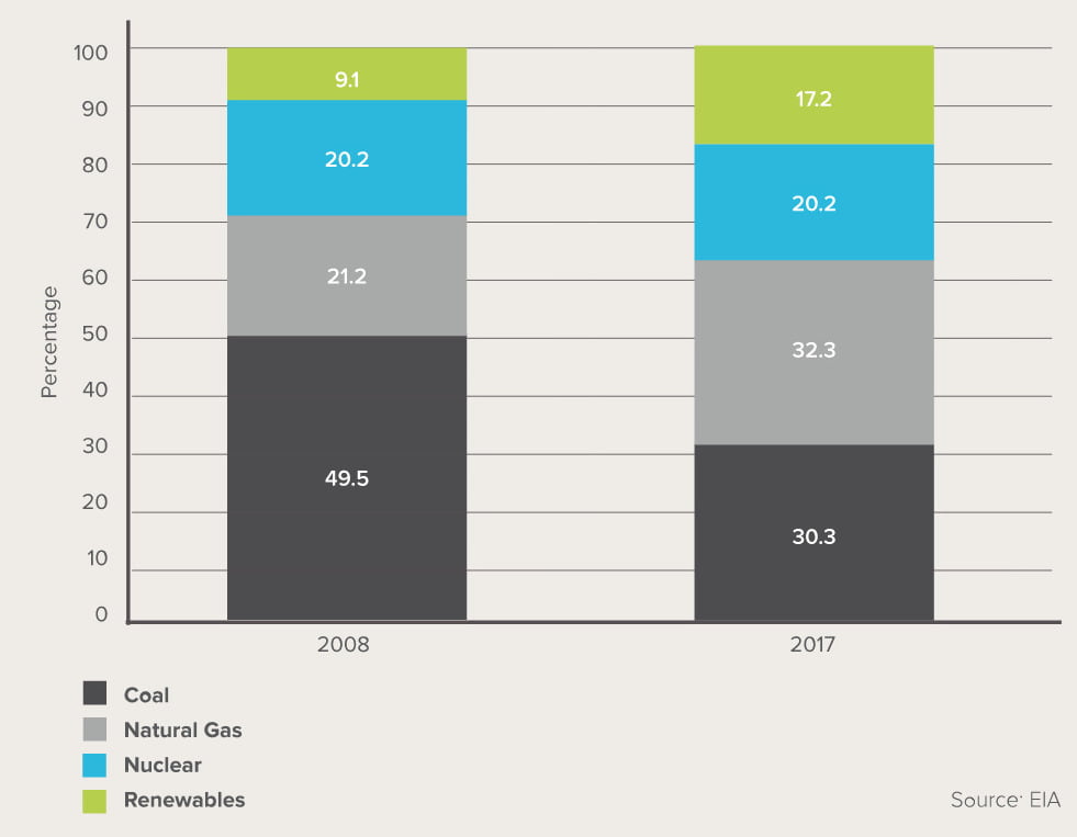 The United States is making significant progress in replacing coal with clean energy, with overall coal use declining from over 50 percent of electricity generation to under 30 percent in less than a decade. While Figure 1 shows the grid has gotten cleaner in the last decade by reducing coal and increasing renewable sources of electricity like wind and solar, there is still a long way to go before our grid becomes carbon-free. RMI’s Economics of Electrifying Buildings report clearly shows that electrifying the building stock today will result in carbon reductions in the majority of the United States. Additionally, in the pockets of the country where coal power is currently a significant portion of the electricity mix, many coal plants are expected to be shut down in the foreseeable future in favor of renewable energy sources.