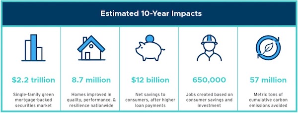 With a readily accessible metric to document homes with small carbon footprints and a clearinghouse to verify that information, Fannie and Freddie can more easily support higher loan amounts for energy-efficient homes and efficiently bundle these home mortgages to sell them as green MBSs to investors seeking environmentally beneficial investments.