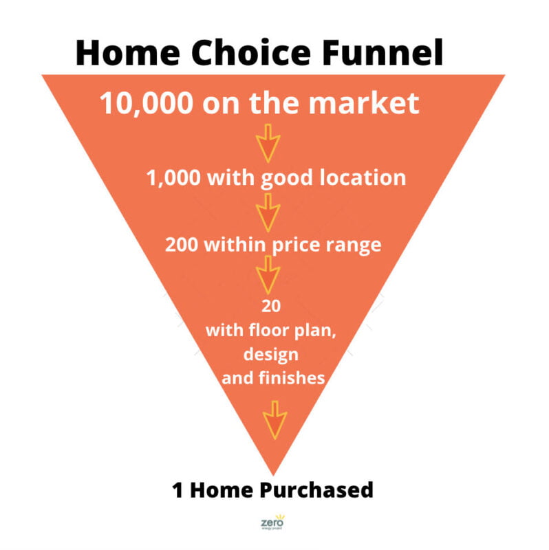 Each of the homebuyer values listed above can become part of a rough conceptual home choice funnel with thousands of homes meeting the first value (location) and very few homes meeting all values.