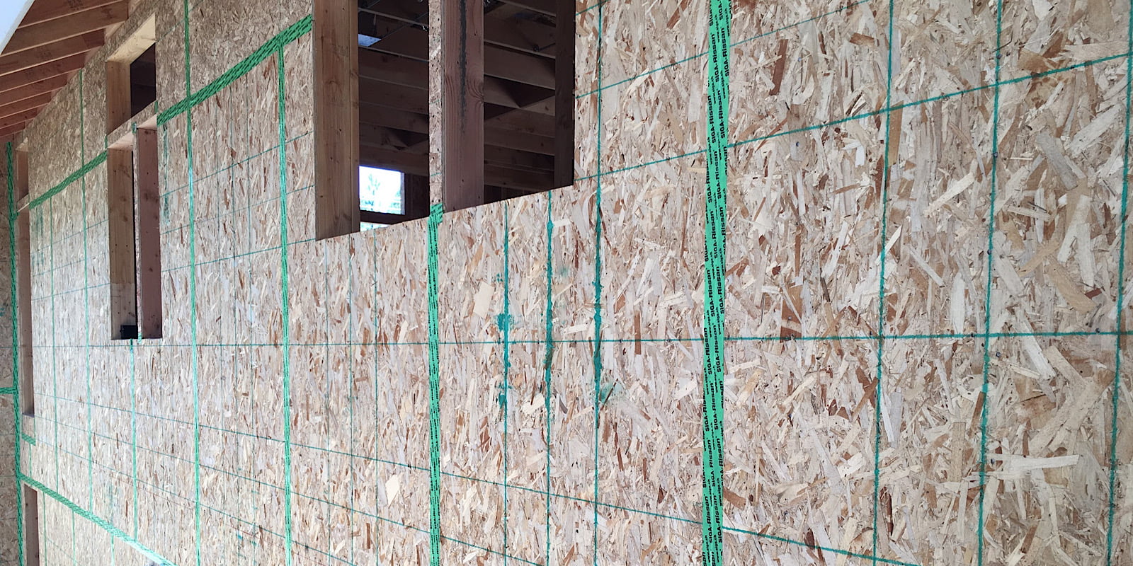 Among the proprietary products gaining momentum is a system that integrates structural sheathing, air sealing, and weather barrier functions. The ZIP System is easily spotted by the strong green color of the weather barrier layer adhered to the outer surface of the sheathing. Combined with special tape for covering the joints and flashing openings, the ZIP System provides a basic exterior air barrier. Like the systems mentioned above, some builders are convinced that higher material cost is balanced by less labor and a faster build.